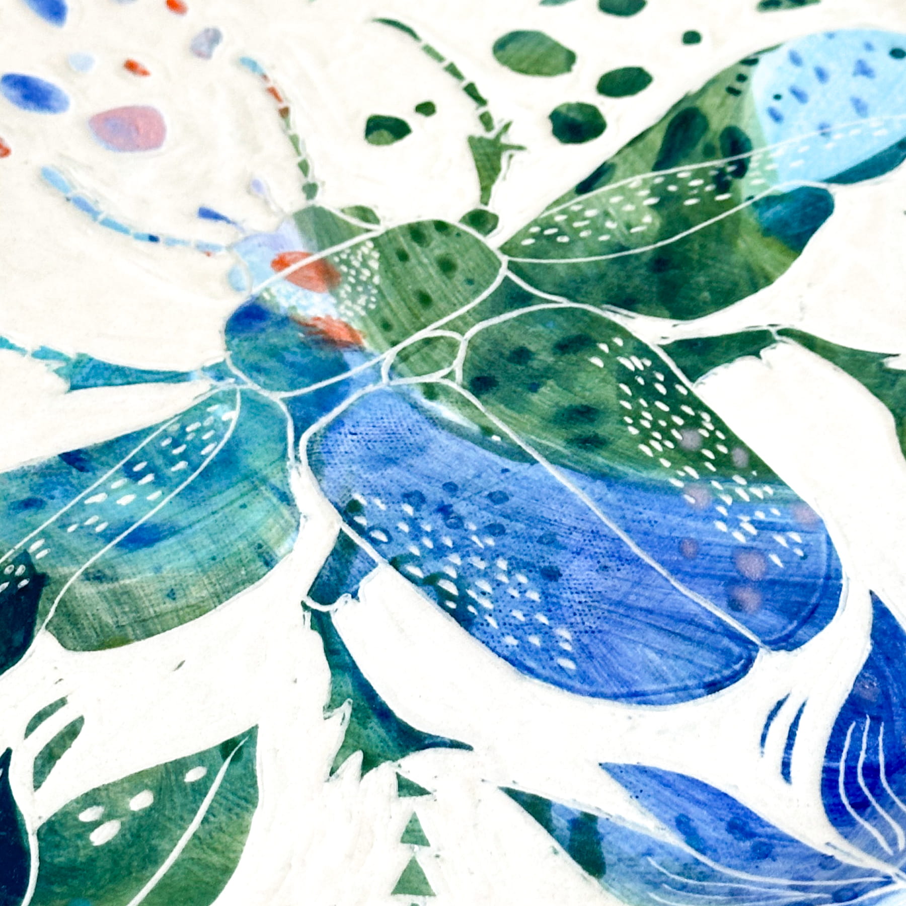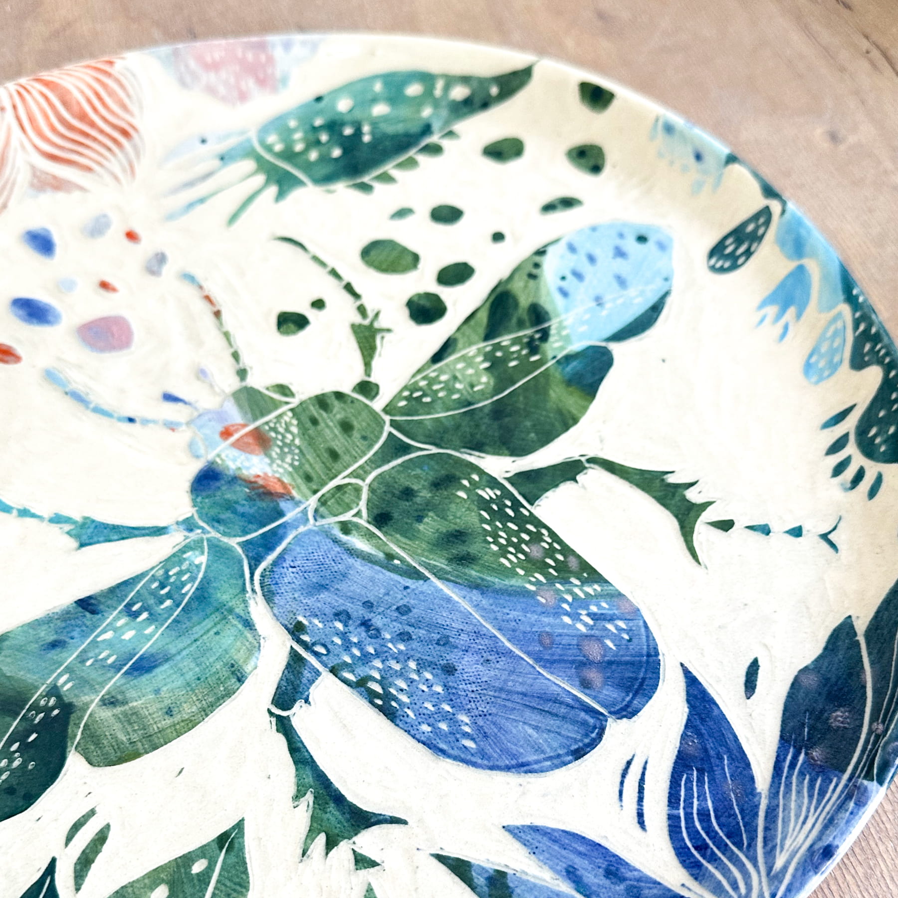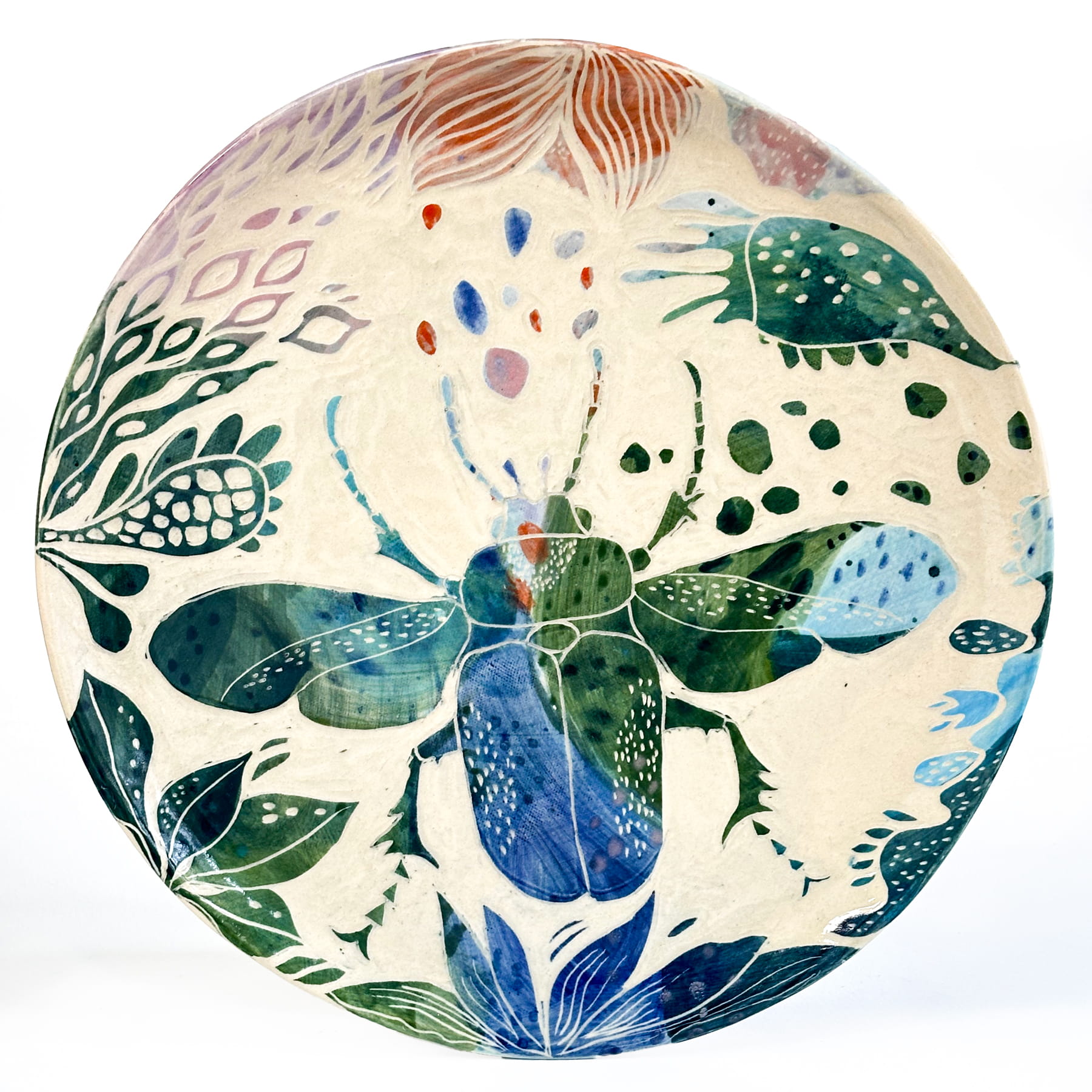 Duża, ręcznie wykonana patera z centralnym motywem chrząszcza. Powierzchnia została malowana farbami podszkliwnymi w sposób przypominający akwarelę – kolory przenikają się miękko, tworząc subtelne przejścia tonalne. Ilustracja owada została wykonana techniką sgraffito – wydrapana w warstwie barwionej gliny, dzięki czemu rysunek ma wyraźną, lekko wyczuwalną strukturę.
