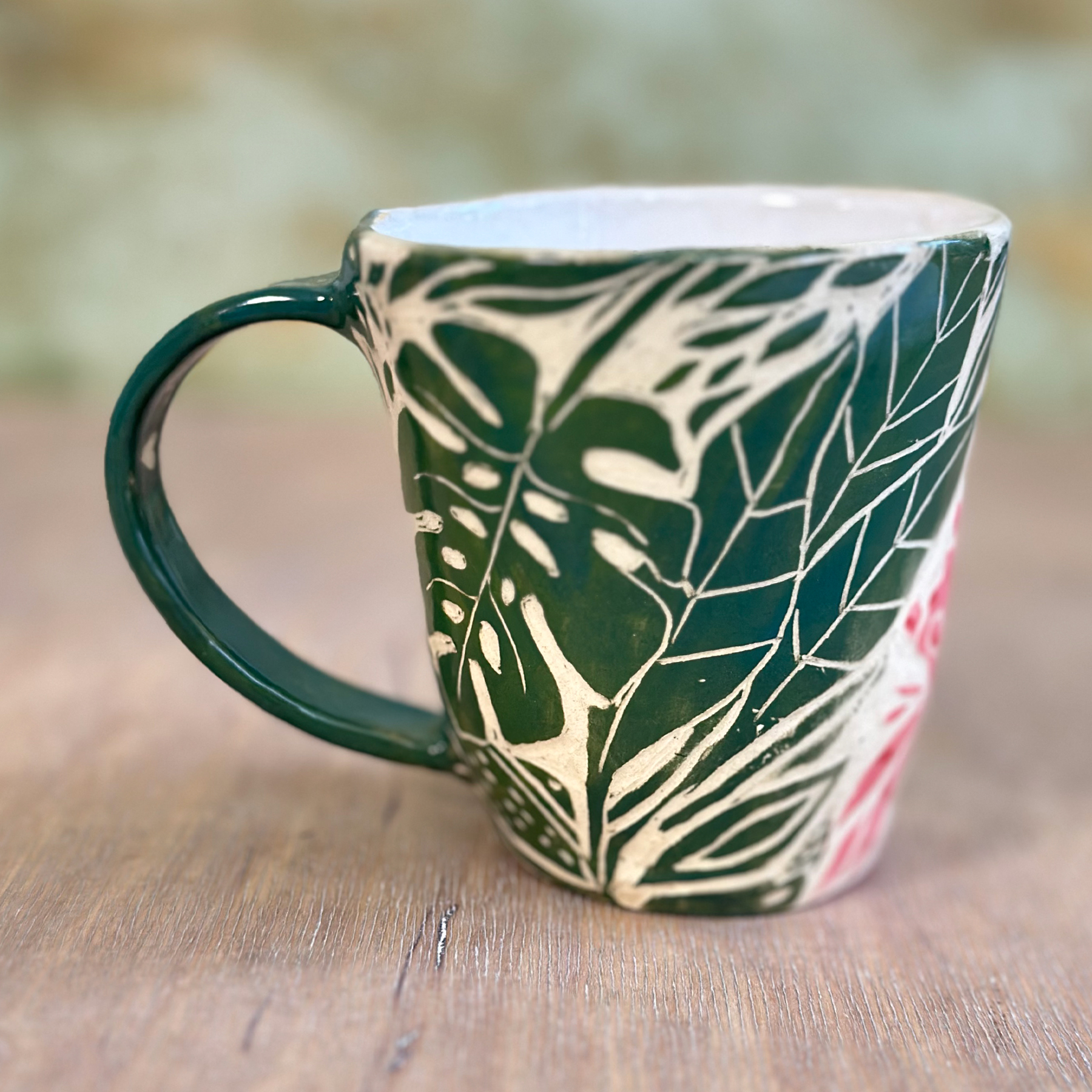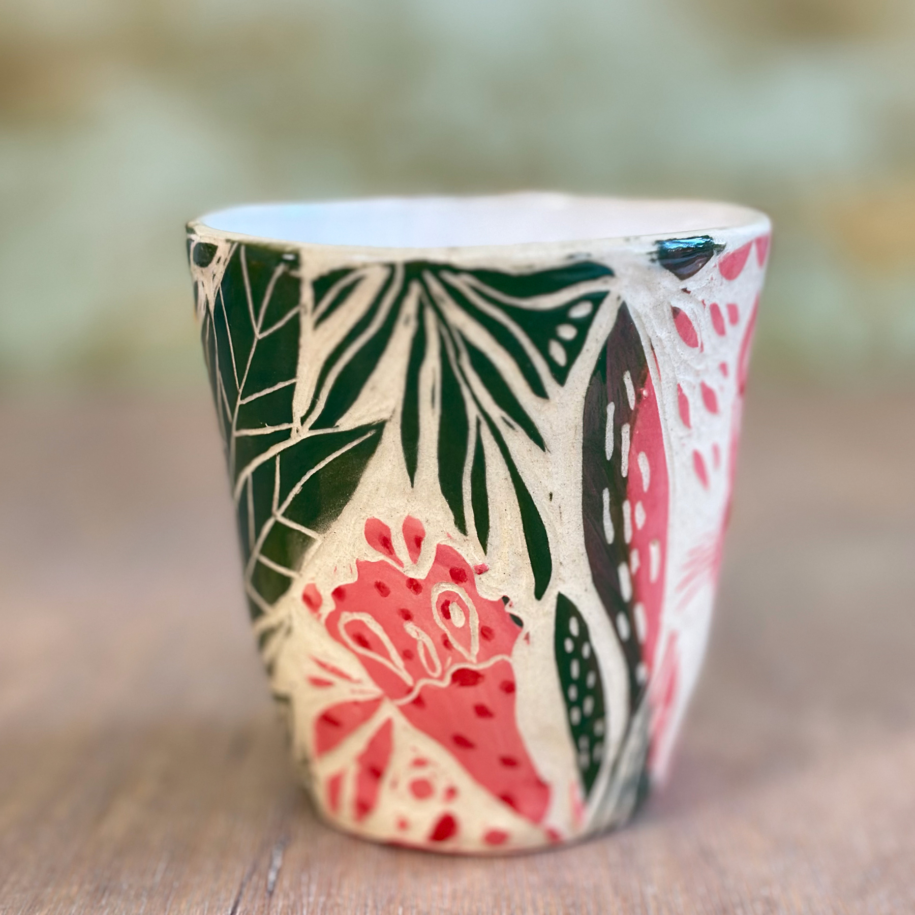 Ręcznie wykonany kubek z motywem różowego lamparta.. Ilustracja została wykonana techniką sgraffito – wydrapana w barwionej glinie, dzięki czemu rysunek ma wyraźną linię i lekko wyczuwalną pod palcami strukturę.