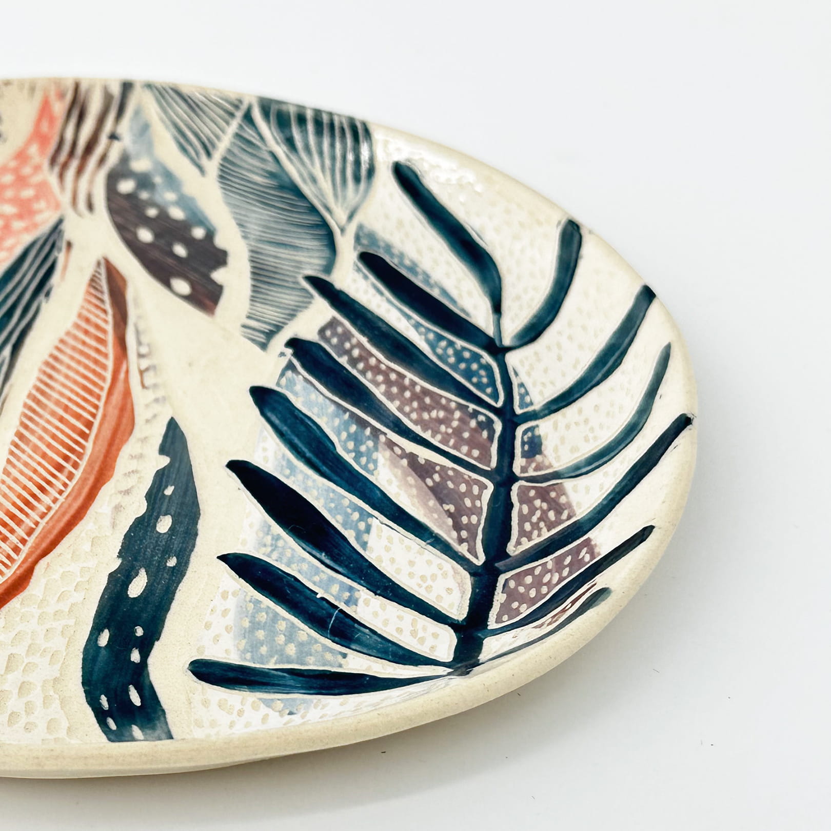 Ten wykonany techniką sgraffito talerz, ma wyczuwalną strukturę – wzór został wydrapany w powierzchni barwionej gliny, a następnie pokryty szkliwem, które wydobywa kontrast między rysunkiem a tłem. Tekstura zachęca, by jej dotknąć, poczuć, zatrzymać się na chwilę.