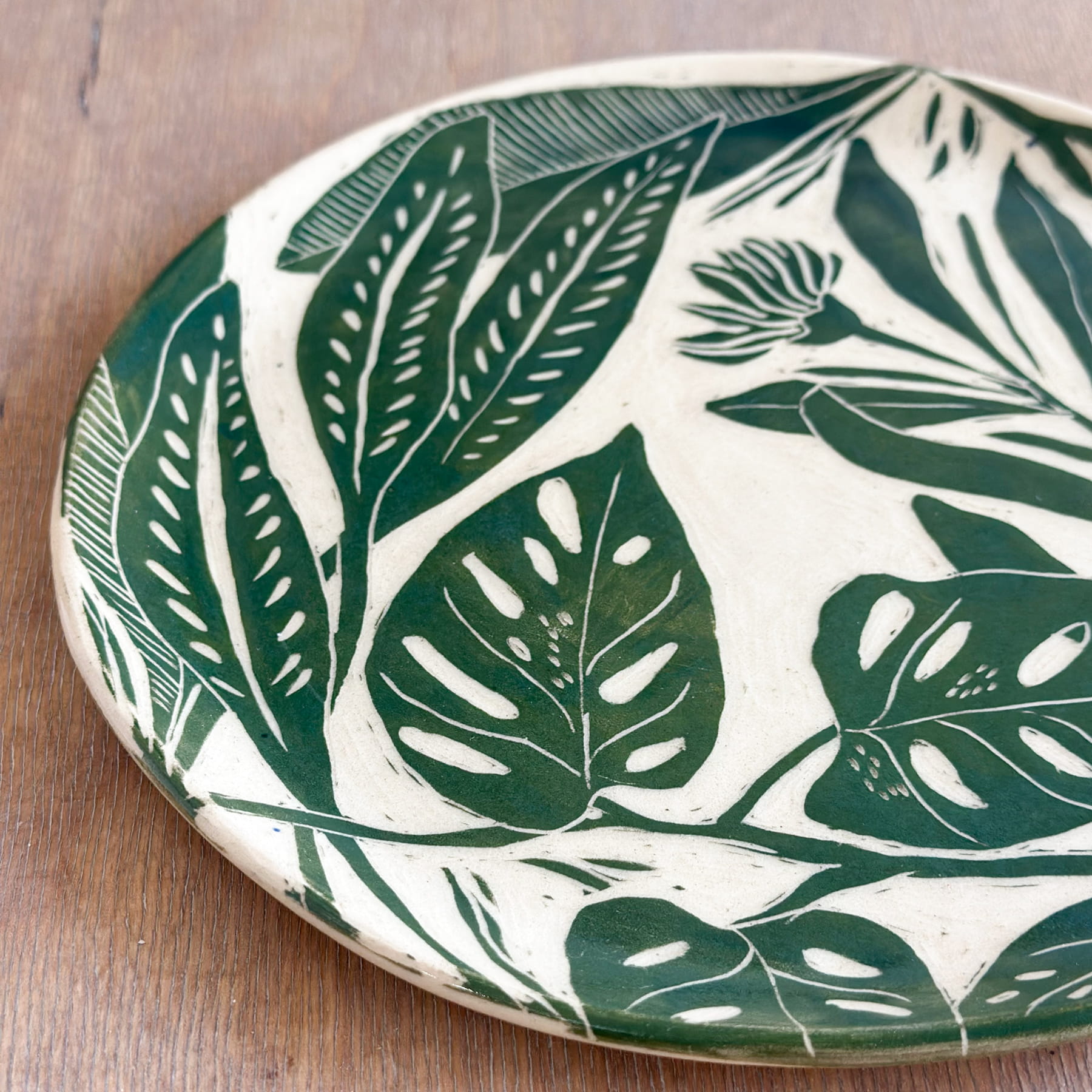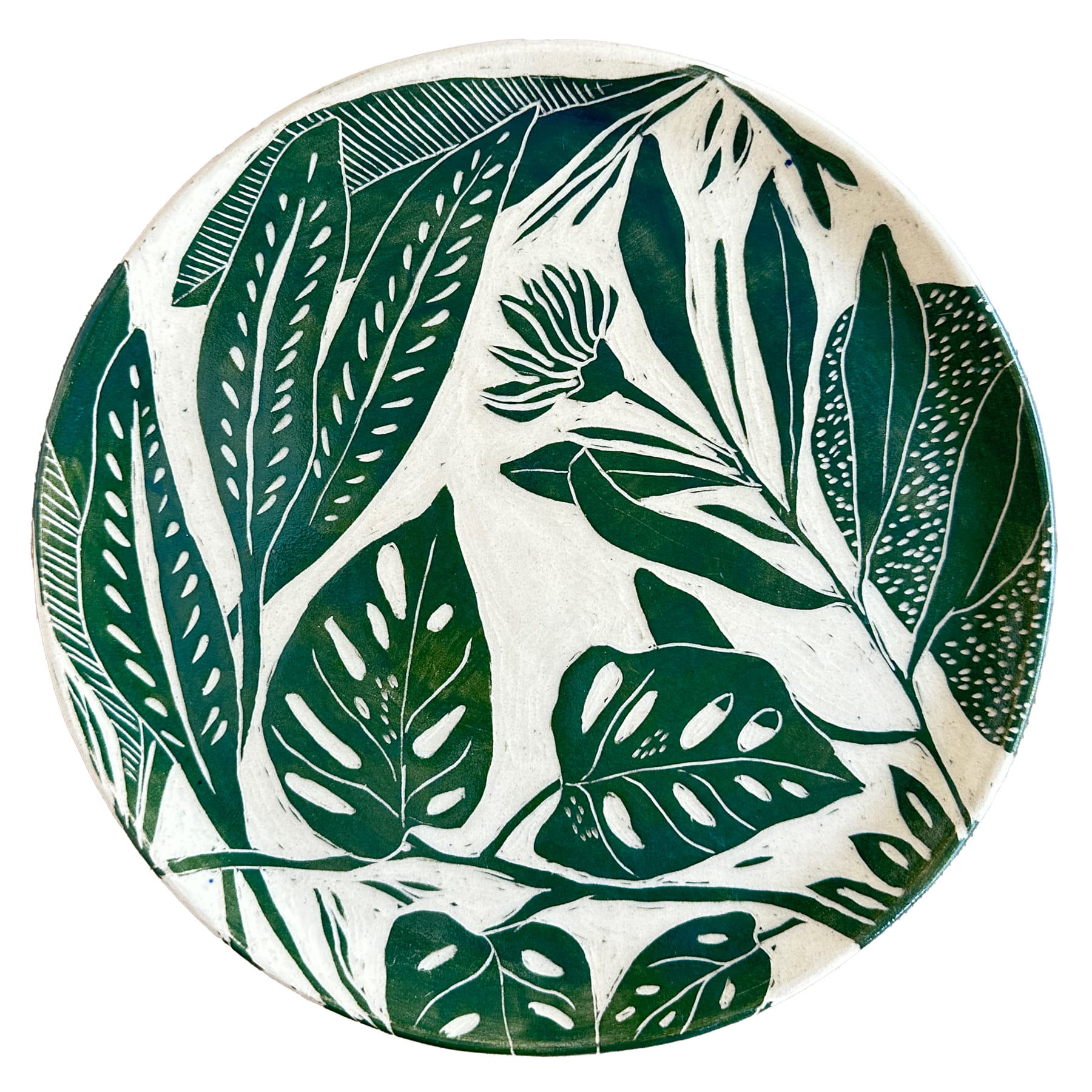 Ten talerz powstał w technice sgraffito – wzór został ręcznie wydrapany w barwionej glinie, a następnie pokryty szkliwem, które podkreśla kontrast między jasnym rysunkiem a głęboką zielenią tła. Powierzchnia nie jest idealnie gładka – ma swoją strukturę, drobne ślady pracy ręki, które zostają i są częścią całości.